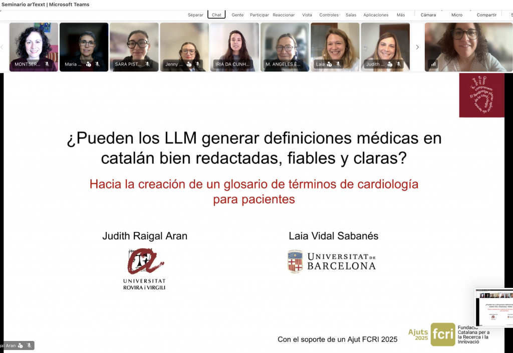 Judith Raigal (Universitat Rovira i Virgili) and Laia Vidal (Universitat de Barcelona) gave a talk at the arText 2025/26 pre- and post-doctoral seminar. They presented an analysis of the quality of plain language medical definitions in Catalan generated using LLMs, as part of their outreach project “Quan el cor parla i el comprenem”, which has received a 2025 grant from the Fundació Catalana per a la Recerca i la Innovació. A spectacular piece of work!