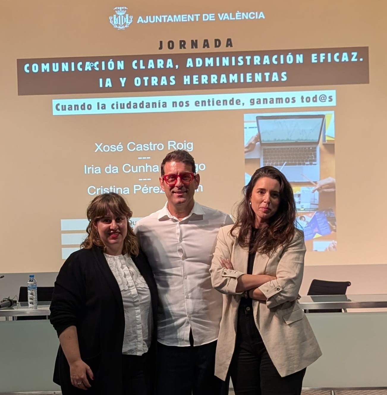 El Ayuntamiento de Valencia se suma a las iniciativas sobre comunicación clara. Hoy ha celebrado una jornada muy fructífera titulada «Comunicación clara, administración eficaz. IA y otras herramientas». Han intervenido como invitados: Cristina Pérez Galán, Xosé Castro e Iria da Cunha. La conferencia de Iria se ha titulado «Presentación de herramientas de inteligencia artificial aplicables al lenguaje claro en el ámbito administrativo».